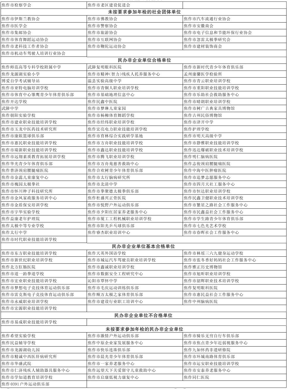 依据《社会团体登记管理条例》《民办非企业单位登记管理暂行条例》以及相关法规定,焦作市民政局依法对2021年12月31日前批准登记成立的社会团体、2021年6月30日前批准登记成立的民办非企业单位进行了年度检查,具体情况如下: