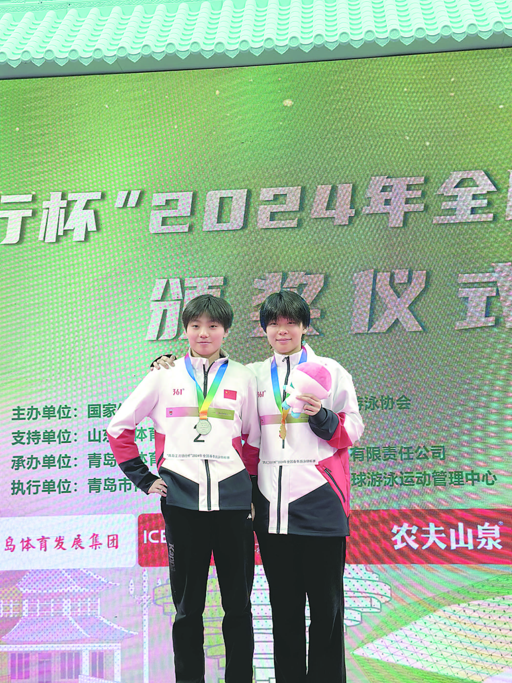 近日,高新区宁郭镇张庄初中九年级一班学生李钦悦和九年级五班学生张钦雯,参加了2024年全国春季游泳锦标赛。本次游泳锦标赛是2024年首个国家级A类游泳赛事,有近900名运动员参赛。比赛中,李钦悦以优异的成绩取得女子400米自由泳和女子800米自由泳两项冠军,且都达到了运动健将等级标准。张钦雯虽未取得个人名次,但比赛成绩远超国家一级运动员标准,非常接近运动健将等级标准。图为李钦悦(右)和亚军选手合影留念。