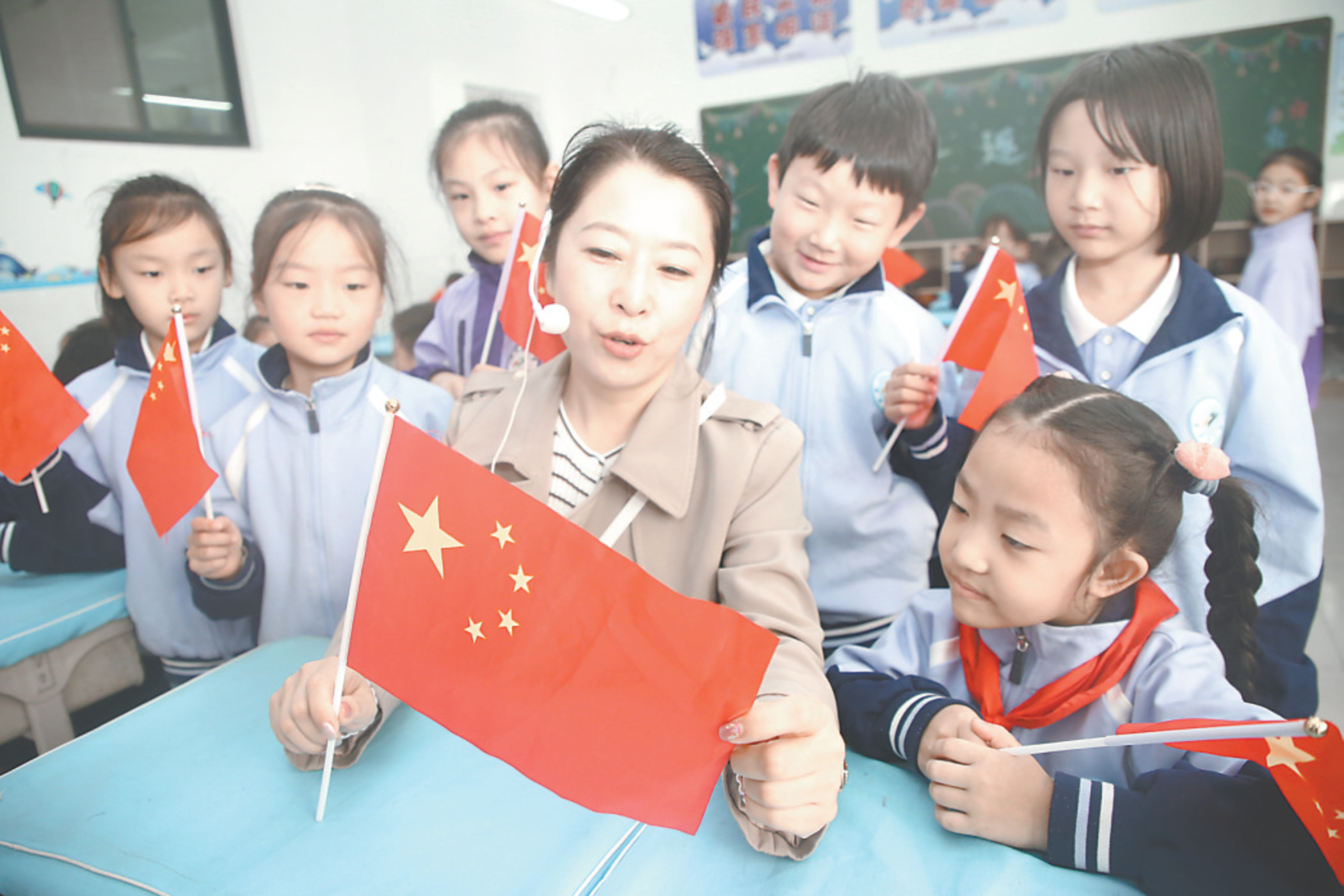 9月24日,解放区映湖路小学开展“国旗在我心中”主题活动,老师在课堂上向孩子们讲述国旗知识。
