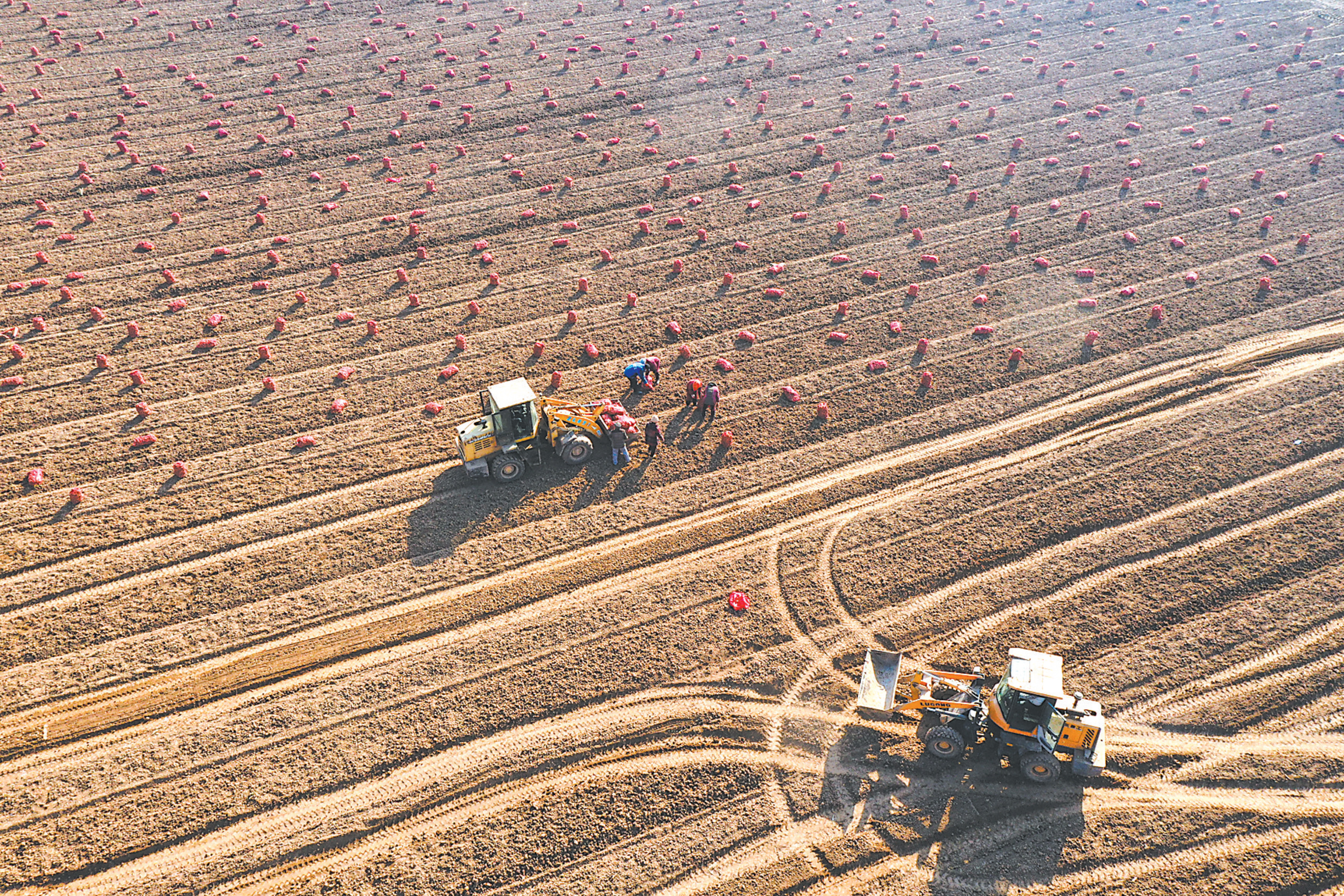 12月6日,沁阳市西向镇北鲁村,农民将收获的怀地黄装车(无人机照片)。天气日渐寒冷,各地农民正抢抓农时开展农业生产。