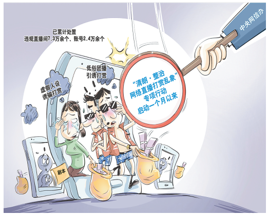 记者12月3日从中央网信办获悉,“清朗·整治网络直播打赏乱象”专项行动启动一个月以来,中央网信办指导督促网站平台,紧盯低俗团播引诱打赏、虚假人设诱骗打赏等突出问题,持续加大清理处置力度,完善打赏规则和管理制度,规范直播打赏营利行为。目前,已累计处置违规直播间7.3万余个、账号2.4万余个。