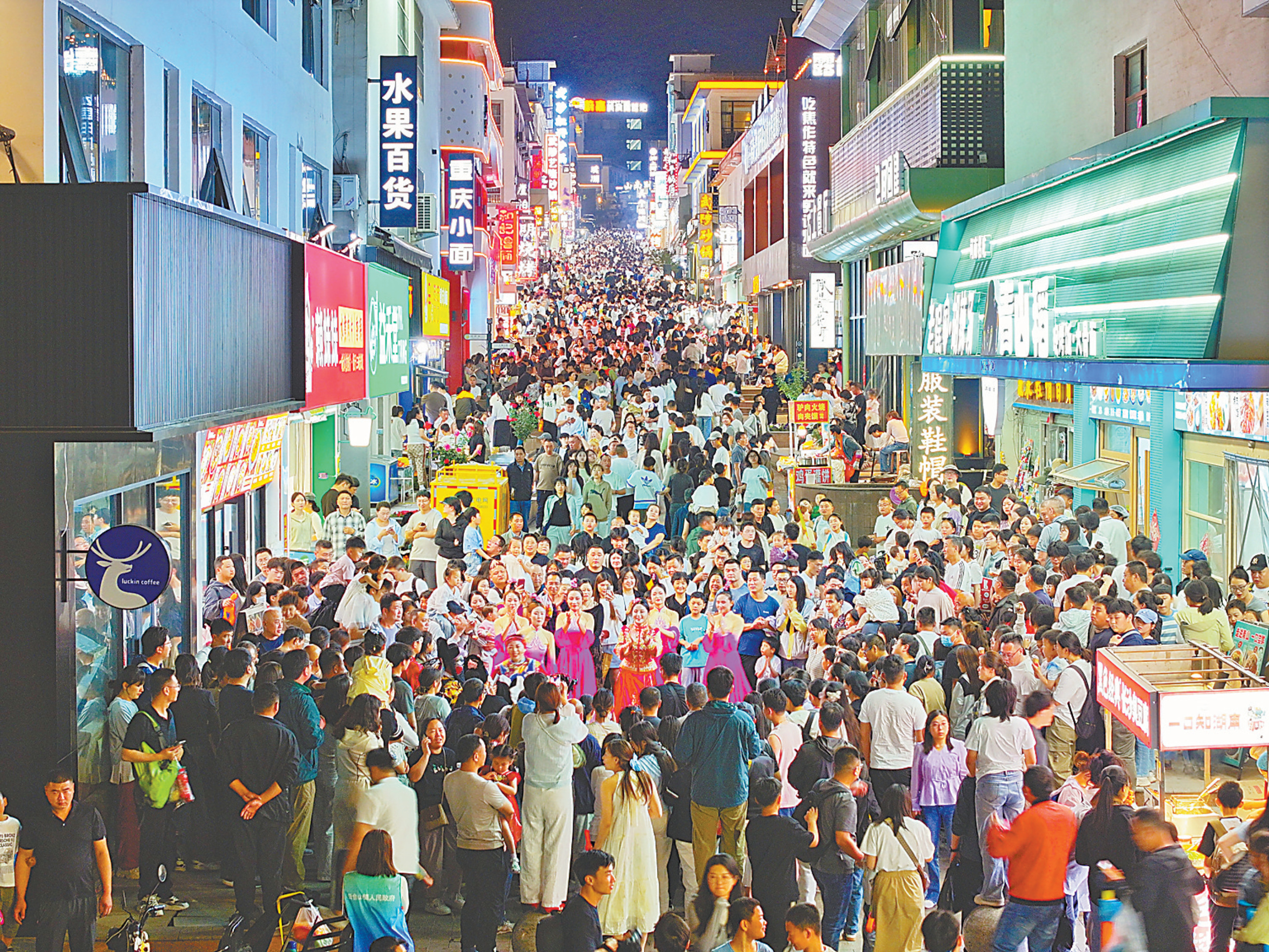 五一期间,修武县云台山镇岸上村,游客正在逛夜市、品美食、观表演。