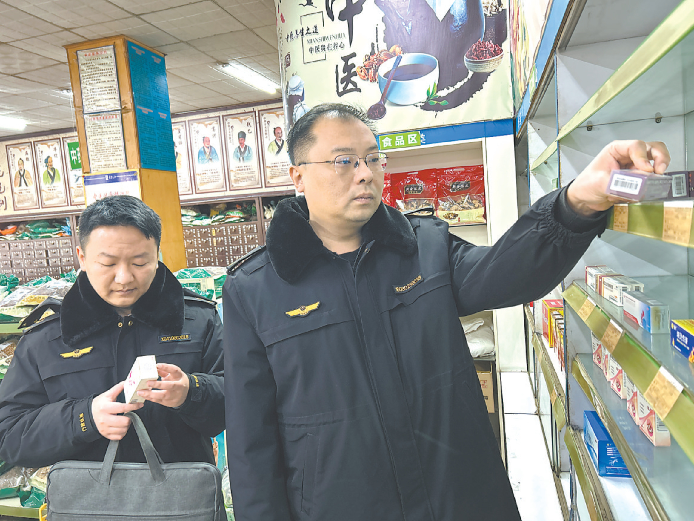 赵志毅(右)在辖区药店进行检查。本报记者 杜挺勇 摄